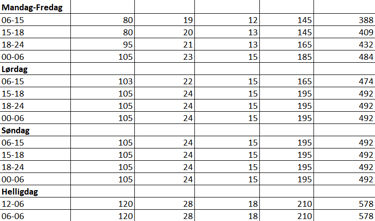 Helligdag/Høytid: påske-, pinse, jul- og nyttårsaften, 1. nyttårsdag, skjærtorsdag, langfredag, 1. og 2. påskedag, Kristi himmelfartsdag, 1. og 2. pinsedag, 1. og 2. juledag, 1. og 17. mai